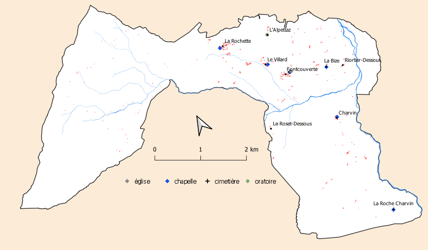 La carte suivante donne la répartition dans la paroisse des édifices religieux.