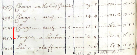 A titre d'illustration, parmi les nombreuses causes d’erreurs possibles, nous notons la suivante qui illustre une anomalie qu’on ne peut pas imputer au géomètre mais au travail de copie du personnel du cadastre de Chambéry, travail réalisé afin d’établir, pour un propriétaire, la liste de ses parcelles qui peuvent être situées dans des lieux‑dits de localisation dispersée.