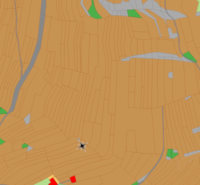 Les champs (en brun sur l’image), sont constitués de bandes de terre en forme de lanières de quelques dizaines à une ou deux centaines de mètres de long mais très étroites, largeurs réduites à une ou deux dizaines de mètres, parfois à quelques mètres seulement.