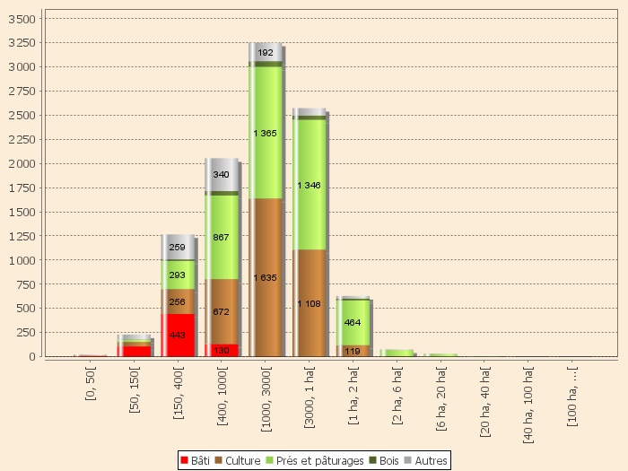 Les deux graphiques suivants donnent la répartition du nombre des parcelles (sur l'axe vertical) par tranches de surfaces inégales mais significatives (barres verticales graduées sur l'axe horizontal en m2 et en hectares pour les parcelles les plus grosses) et, pour chaque tranche, la répartition des parcelles suivant leur utilisation (couleurs différentes). Le nombre de parcelles concernées par chaque utilisation est par ailleurs affiché dans chaque utilisation.