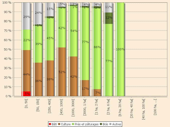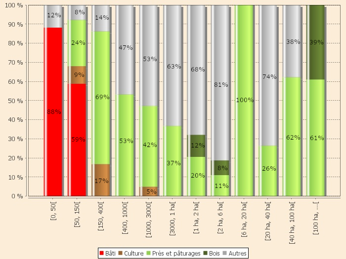 Les cultures couvrent approximativement 40 à 50 % des surfaces dans les parcelles de moins de 3 000 m2 et disparaissent progressivement dans celles comprises entre 3 000 m2 et 2 hectares. Les prés‑pâturages représentent une proportion de surface régulièrement croissante de 20 % à 100 % avec quelques bois et terrains incultes en proportions mineures.