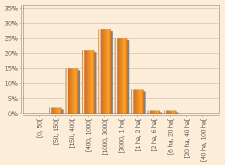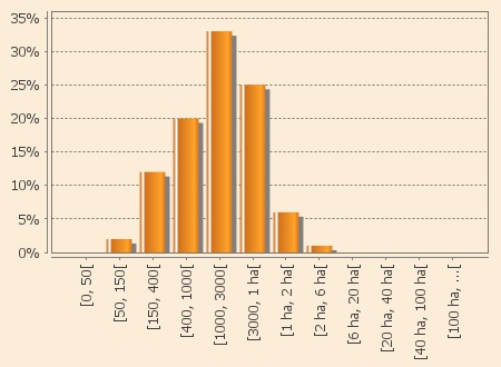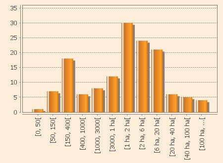 Nous devons d'abord distinguer les parcelles privées des parcelles de la communauté. Leurs surfaces et leurs nombres sont très dissemblables comme le montre les graphiques suivants des parcelles privées à gauche et communales à droite. Sur les graphiques sont portés le nombre de parcelles par tranches de surfaces croissantes.