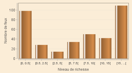 La répartition des « feux » et celle des personnes par niveaux de richesse reproduisent, naturellement, le graphique précédent. Mais les graphiques montrent clairement, par leurs répartitions très particulières, ce qu'a réaliser le recenseur. Plus de 100 « feux » seraient dans la richesse et à peine moins seraient dans l'extrême pauvreté ! Ce qui est absurde.