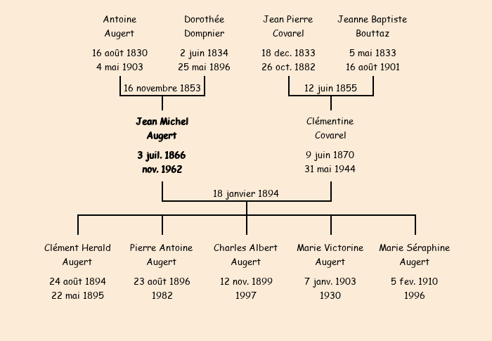 | Epoux : Jean Michel Augert (27 ans, né le 3 juillet1866, cultivateur au Chef Lieu, a signé), fils de Antoine (cultivateur au Chef Lieu, a signé) et de Dorothée Dompnier (cultivatrice, n'a pas su signer) |