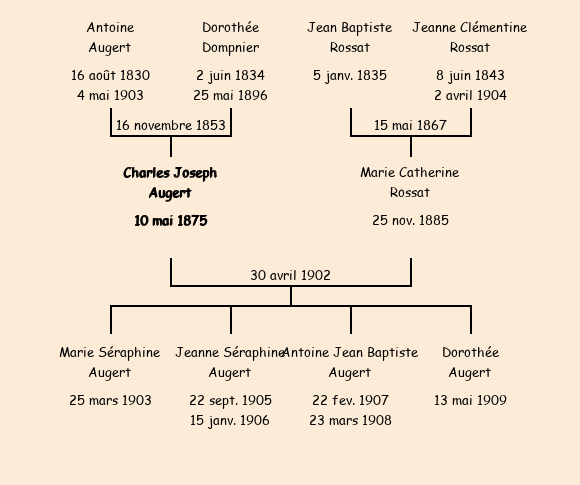 | Epoux : Charles Joseph Augert (26 ans, né le 10 mai1875), fils de Antoine et de Dorothée Dompnier (décédée le 25 mai1896 au Chef Lieu) |