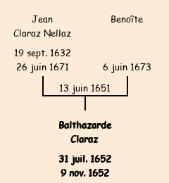 Mère : Benoîte | Marraine : Balthazarde (épouse de Pierre Claraz) |
