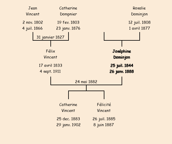 Epoux : Félix Vincent (49 ans, né le 17 avril1833, cultivateur au Chef Lieu, a signé), fils de Jean (décédé le 4 juillet1866) et de Catherine Dompnier (décédée le 24 février1875 (1876)) |