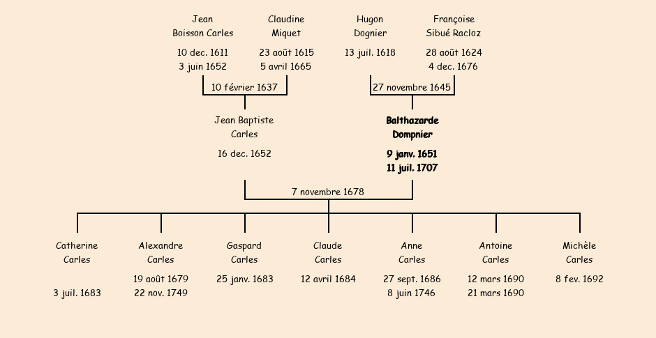 Mariée (27 ans) avec Jean Baptiste Carles (25 ans) le 7 novembre 1678 à Fontcouverte ![]() |