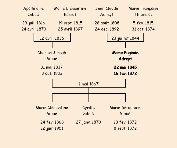 Epoux : Charles Joseph Sibué (29 ans, né le 31 mai1837, cultivateur au Villard, a signé), fils de Apollinaire (cultivateur, a signé) et de Marie Clémentine Rossat (cultivatrice, n'a pas su signer) |