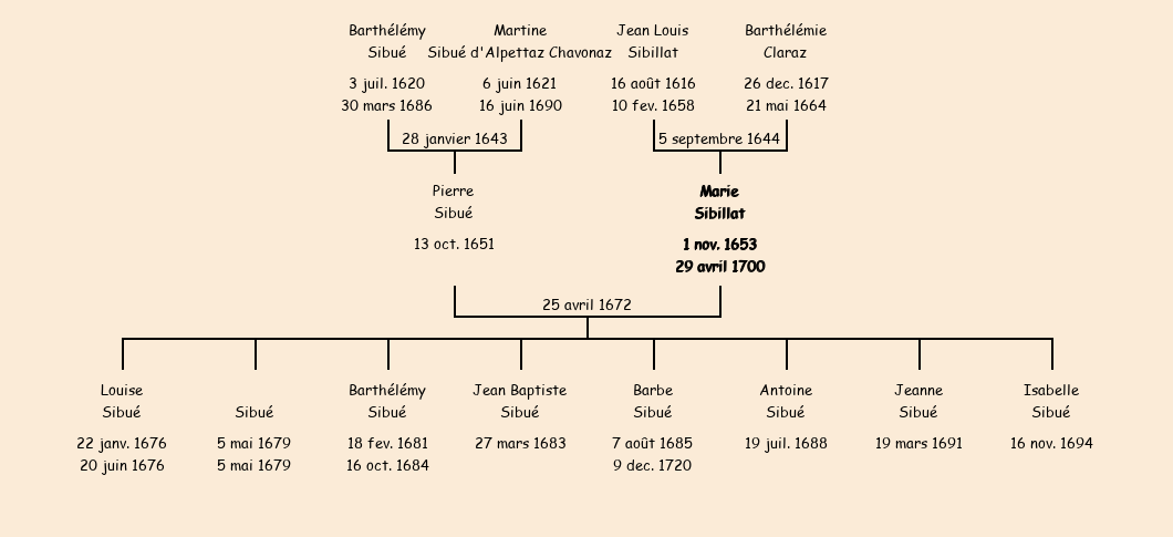 Mariée (18 ans) avec Pierre Sibué (20 ans) le 25 avril 1672 à Fontcouverte ![]() |