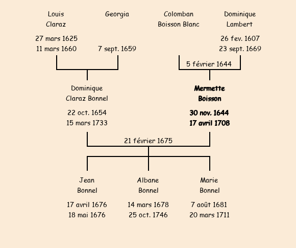 Mariée (30 ans) avec Dominique Claraz Bonnel (20 ans) le 21 février 1675 à Fontcouverte ![]() |