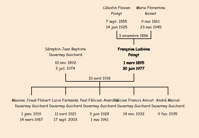 Epouse : Françoise Ludivine Poingt (née le 1er mars01895, de Charvin), fille de Célestin Flavien (de Charvin, excusé ayant donné son consentement le 6 avril courrant) et de Marie Florentine Rossat (de Charvin) |