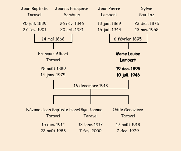 Epouse : Marie Louise Lambert (née à Fontcouverte le 19 décembre1895, de La Bise), fille de Jean Pierre (de La Bise) et de Sylvie Bouttaz (de La Bise) |