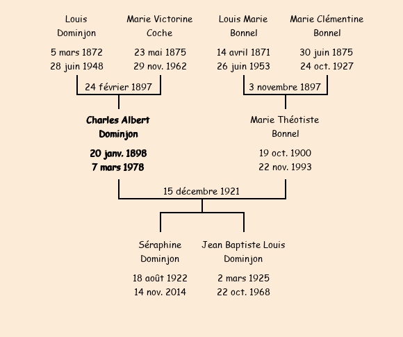 Epoux : Charles Albert Dominjon (né à Fontcouverte le 20 janvier 1898), fils de Louis et de Marie Victorine Coche |