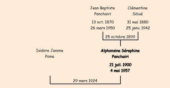 Epouse : Alphonsine Séraphine Panchairi (23 ans, née à Fontcouverte le 21 juillet1900, de La Bise, négociante), fille de Jean Baptiste et de Clémentine Sibué |