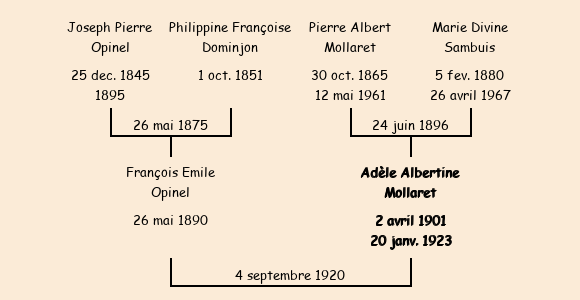 Epoux : François Emile Opinel (forgeron né à Albiez le Vieux le 26 mai1890, domicilié à Gévoudaz), fils de feu Joseph et de feue Françoise Dominjon |