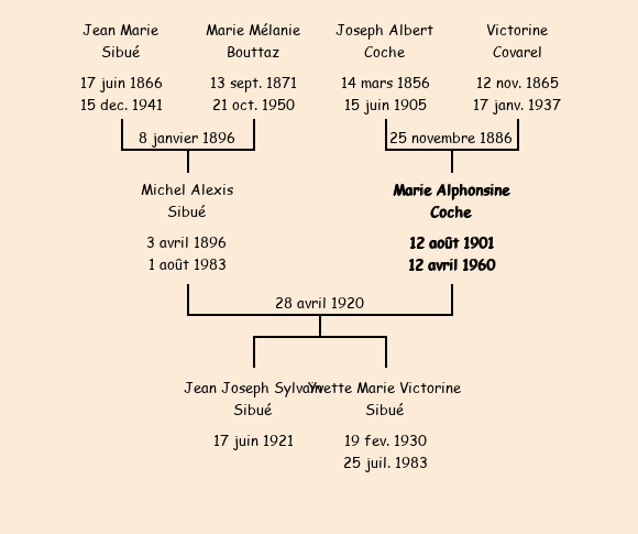 Epoux : Michel Alexis Sibué (24 ans, né à Fontcouverte le 3 avril1896, domicilié à La Bise), fils de Jean Marie et de Marie Mélanie Bouttaz |