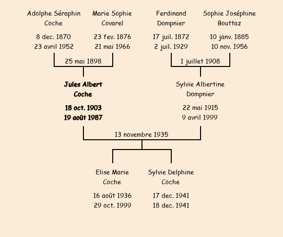 Epouse : Sylvie Albertine Dompnier (20 ans, née à Fontcouverte le 2 mai1915, des Enversets), fille de feu Ferdinand et de Sophie Joséphine Bouttaz |