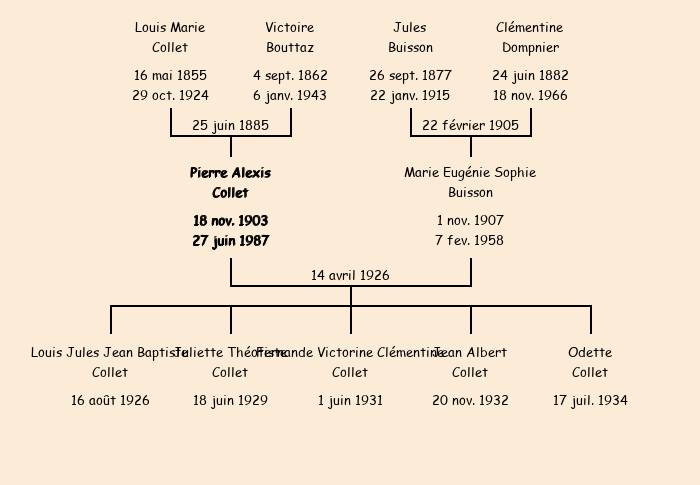Epoux : Pierre Alexis Collet (22 ans, né à Fontcouverte le 18 novembre1903, domicilié à La Rochette), fils de feu Louis Marie et de Victoire Bouttaz |