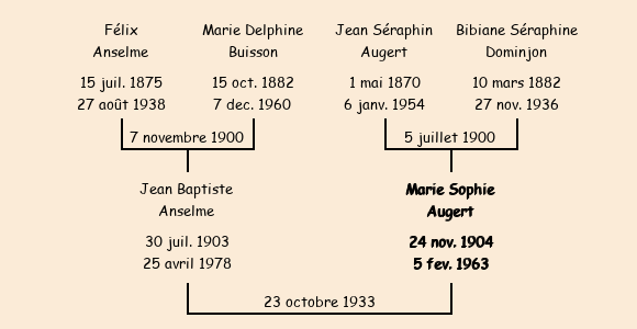 Epoux : Jean Baptiste Anselme (30 ans, né à Fontcouverte le 30 juillet1903), fils de Félix et de Marie Delphine Buisson |