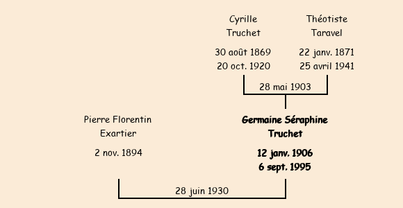 Epouse : Germaine Séraphine Truchet (24 ans, née à Fontcouverte le 11 janvier 1906, de L'Alpettaz), fille de feu Cyrille et de Théotiste Taravel |