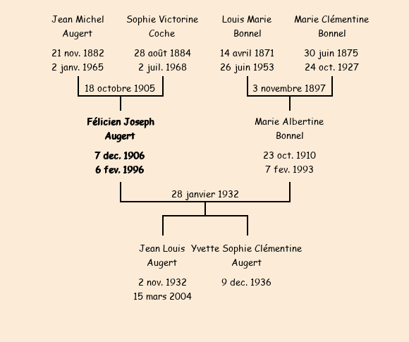 Epoux : Félicien Joseph Augert (25 ans, né à Fontcouverte le 7 décembre1906, domicilié au Chef Lieu), fils de Jean Michel et de Sophie Victorine Coche |