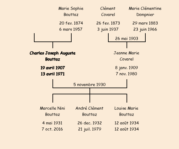 Epoux : Charles Joseph Auguste Bouttaz (23 ans, né à Fontcouverte le 19 avril1907, domicilié aux Anselmes), fils de Marie Sophie Bouttaz |