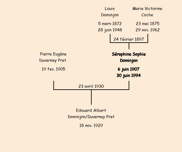Epouse : Séraphine Sophie Dominjon (22 ans, née à Fontcouverte le 6 juin1907, de Prés sous Marin), fille de Louis et de Victorine Coche |