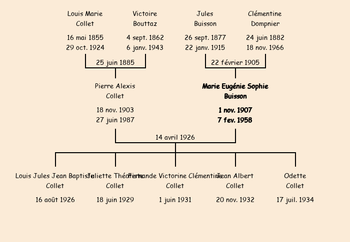 Epoux : Pierre Alexis Collet (22 ans, né à Fontcouverte le 18 novembre1903, domicilié à La Rochette), fils de feu Louis Marie et de Victoire Bouttaz |