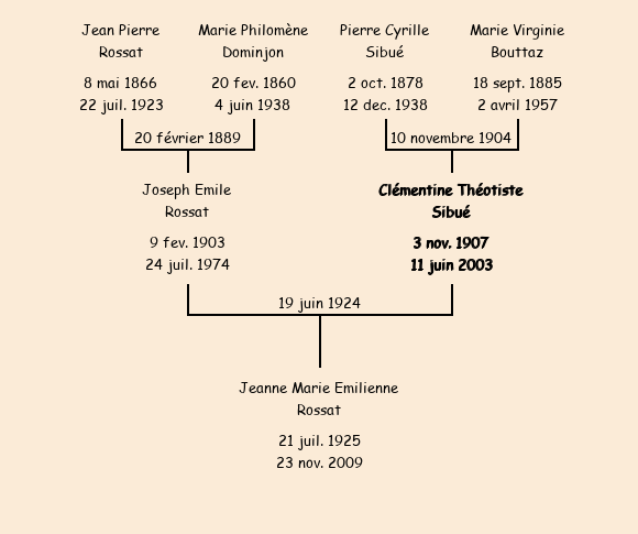 Epouse : Clémentine Théotiste Sibué (16 ans, née à Fontcouverte le 3 novembre1907, de La Bise), fille de Pierre Cyrille et de Marie Virginie Bouttaz |