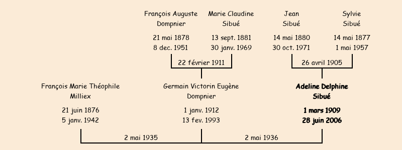 Epouse : Adeline Delphine Sibué (27 ans, née à Fontcouverte le 1er mars1909, de La Bise), fille de Jean et de Sylvie Sibué |