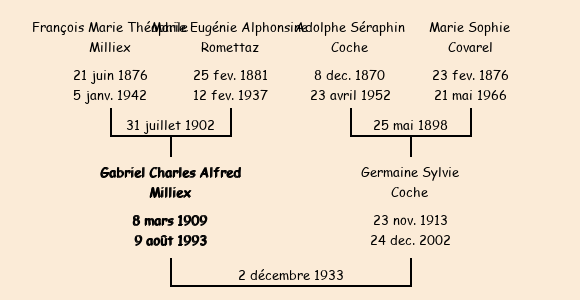 Epoux : Gabriel Charles Alfred Milliex (24 ans, né à Fontcouverte le 8 mars1909, domicilié à Charvin), fils de François Marie et de Marie Eugénie Romettaz (de Charvin) |