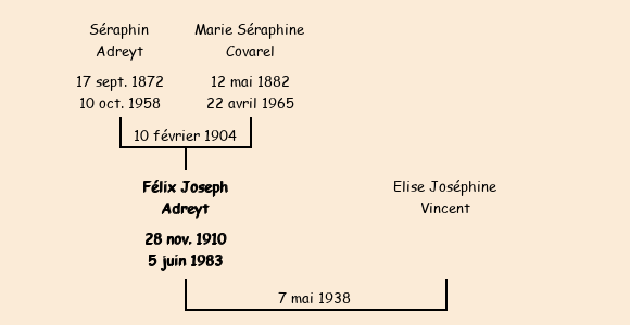 Epouse : Elise Joséphine Vincent (23 ans, née à Fontcouverte le 17 mars1915, du Crêt, couturière), fille de Joseph Jean Baptiste et de Marie Honorine Dominjon |