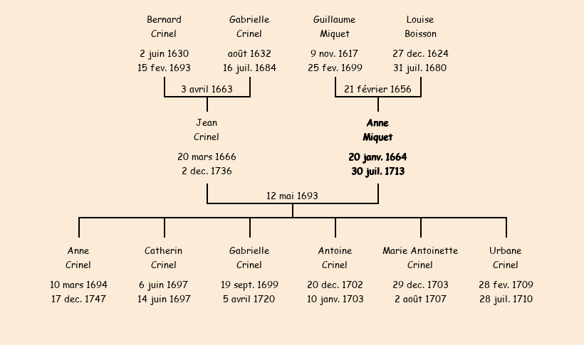 Mariée (29 ans) avec Jean Crinel (27 ans) le 12 mai 1693 à Fontcouverte ![]() |