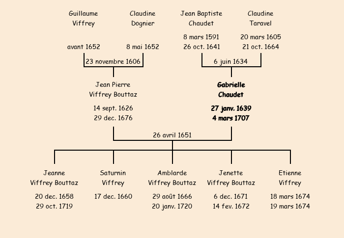 Mariée (12 ans) avec Jean Pierre Viffrey Bouttaz (24 ans) le 26 avril 1651 à Fontcouverte ![]() |