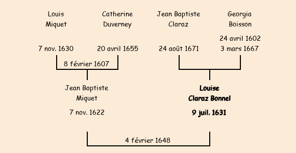 Mariée (16 ans) avec Jean Baptiste Miquet (25 ans) le 4 février 1648 à Fontcouverte ![]() |