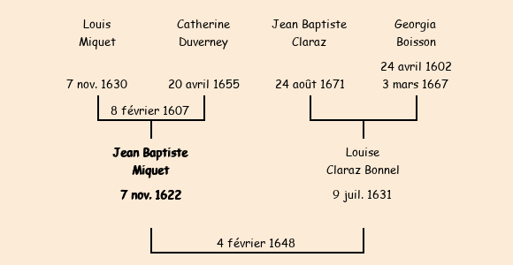Marié (25 ans) avec Louise Claraz Bonnel (16 ans) le 4 février 1648 à Fontcouverte ![]() |
