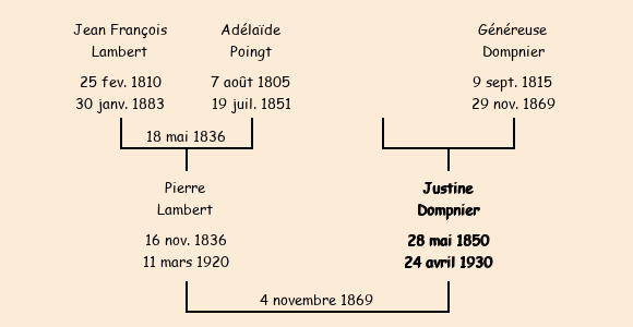 Epoux : Pierre Lambert (33 ans, né le 16 novembre1836, garde forestier à Charvin, veuf de Marie Baptiste Michel décédée le 1er juillet1868, a signé), fils de Jean François (cultivateur, a signé) et de Adelaïde Poingt (décédée le 19 juillet1853) |