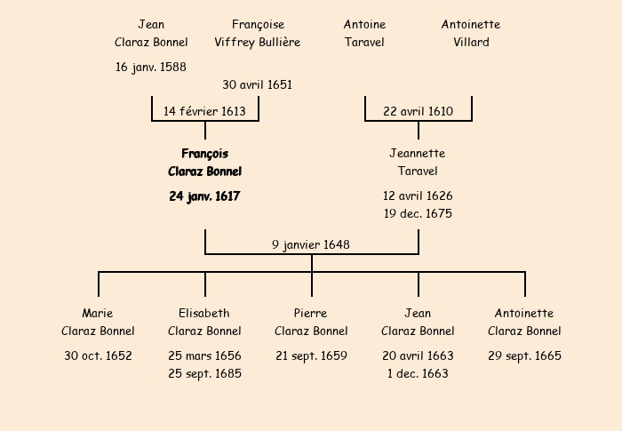 Père : Jean Claraz Bonnel | Parrain : François Viffrey Bullière (fils de Gaspard, Jean dans une autre version) |