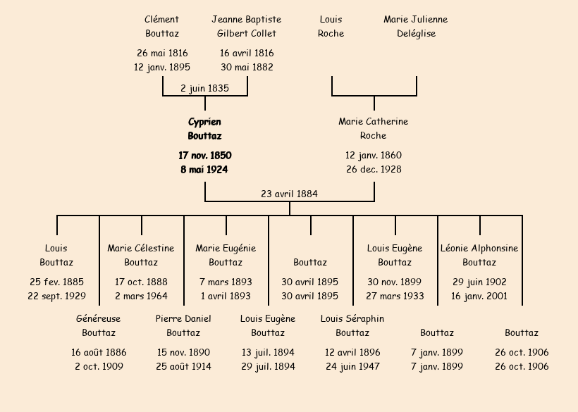 Epoux : Cyprien Bouttaz (33 ans, né le 17 novembre1850, cultivateur de Tillerèche, a signé), fils de Clément (cultivateur, a signé) et de Jeanne Baptiste Gilbert Collet (décédée le 30 mai1882) |