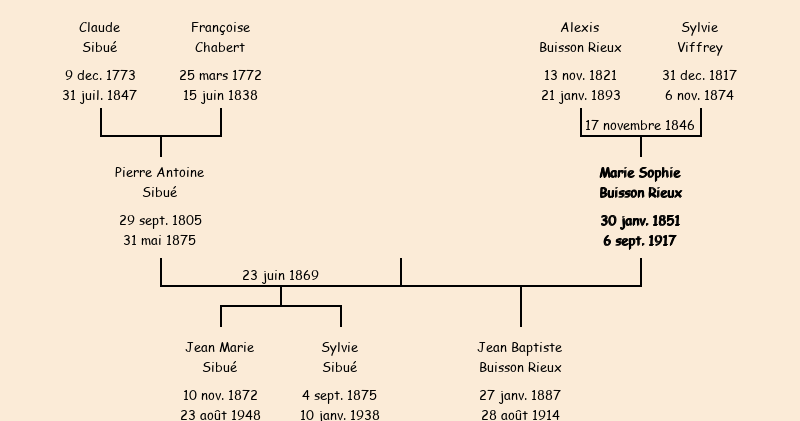 Epouse : Marie Sophie Buisson Rieux (18 ans, née le 30 janvier 1851, de L'Alpettaz, cultivatrice, a signé), fille de Alexis (cultivateur, a signé) et de Sylvie Viffrey (cultivatrice, n'a pas su signer) |