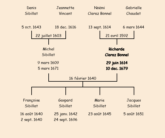 Mariée (25 ans) avec Michel Sibillat (30 ans) le 16 février 1640 à Fontcouverte ![]() |