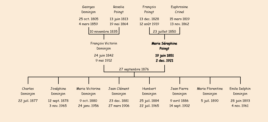 Epoux : François Victorien Dominjon (34 ans, né le 24 juin1842 à Charvin, cultivateur à Charvin, a signé), fils de Georges (décédé le 4 mars1859) et de Rosalie Poingt (décédée le 19 mai1864) |