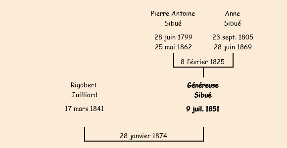 Epouse : Généreuse Sibué (23 ans, de La Bise, cultivatrice), fille de feu Pierre Antoine et de feue Anne Sibué |