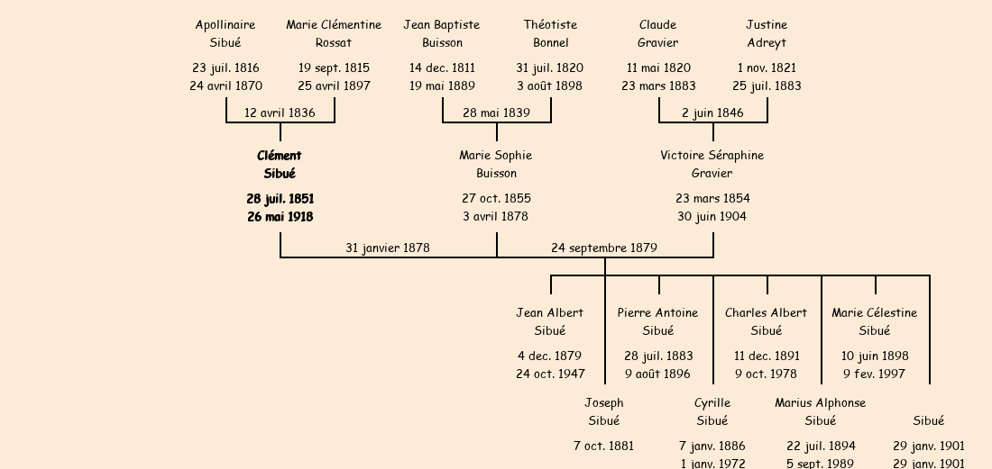 Epoux : Clément Sibué (28 ans, né le 28 juillet1851, cultivateur au Villard, veuf de Sophie Buisson décédée le 4 avril1878, a signé), fils de Apollinaire (décédé le 25 avril1870) et de Clémentine Rossat (ménagère, n'a pas su signer) |