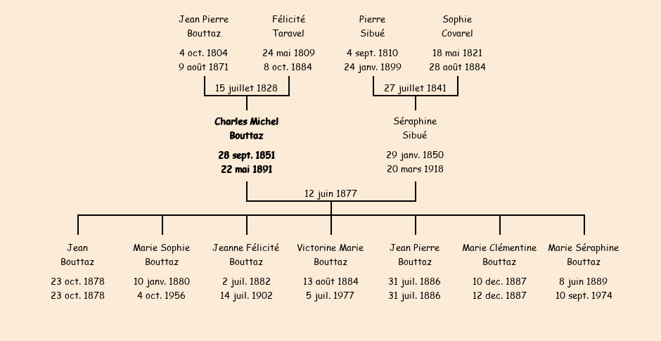 | Epoux : Charles Michel Bouttaz (26 ans né le 28 septembre1851, cultivateur Chef Lieu, a signé), fils de Jean Pierre (décédé le 9 août1871) et de Félicité Taravel (ménagère, n'a pas su signer) |