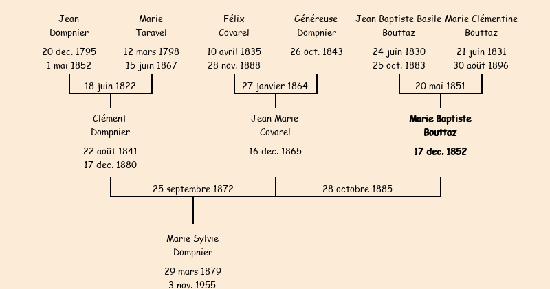 Epouse : Marie Baptiste Bouttaz (19 ans, née le 17 décembre1852, du Chef Lieu, cultivatrice, a signé), fille de Jean Baptiste (cultivateur au Chef Lieu, a signé) et de Clémentine Bouttaz (cultivatrice au Chef Lieu, n'a pas su signer)