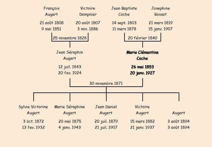 Epoux : Jean Séraphin Augert (28 ans, né le 12 juillet 1843, cultivateur au Chef Lieu, a signé), fils de François (décédé le 9 mai1851) et de Victorine Dompnier (ménagère, n'a pas su signer) |