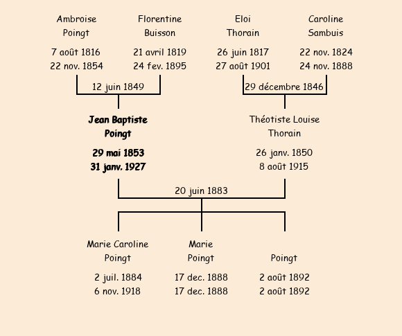 Epoux : Jean Baptiste Poingt (30 ans, né le 29 mai1853, cultivateur à La Brévière, a signé), fils de Ambroise (décédé le 26 novembre1854 (22 novembre)) et de Florentine Buisson (ménagère, n'a pas su signer) |