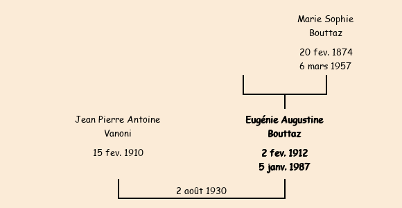 Epoux : Jean Pierre Antoine Vanoni (20 ans, né à Saint Jean de Maurienne le 15 février1910, chaudronnier soudeur), fils de Rodolphe (domicilié à Saint Jean deMaurienne, mineur) et de Marie Françoise Fantin |